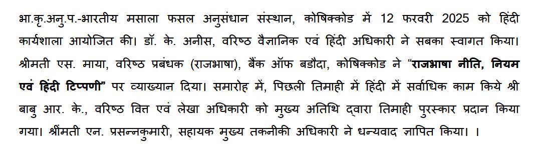 A Hindi Workshop was organized at ICAR-Indian Institute of Spices Research, Kozhikode on 12th February 2025. Dr. K. Anees, Senior Scientist & Hindi Officer welcomed the gathering. Smt. S. Maya, Senior Manager (OL), Bank of Baroda, Kozhikode has delivered a lecture on “Official Language Policy, Rule and Hindi Noting”. During the function, quarterly award for doing maximum Work in Hindi during last quarter was distributed to Sri Babu R. K., Senior Finance & Accounts Officer by the chief guest. Ms. N. Prasannakumari, Assistant Chief Technical Officer proposed vote of thanks.